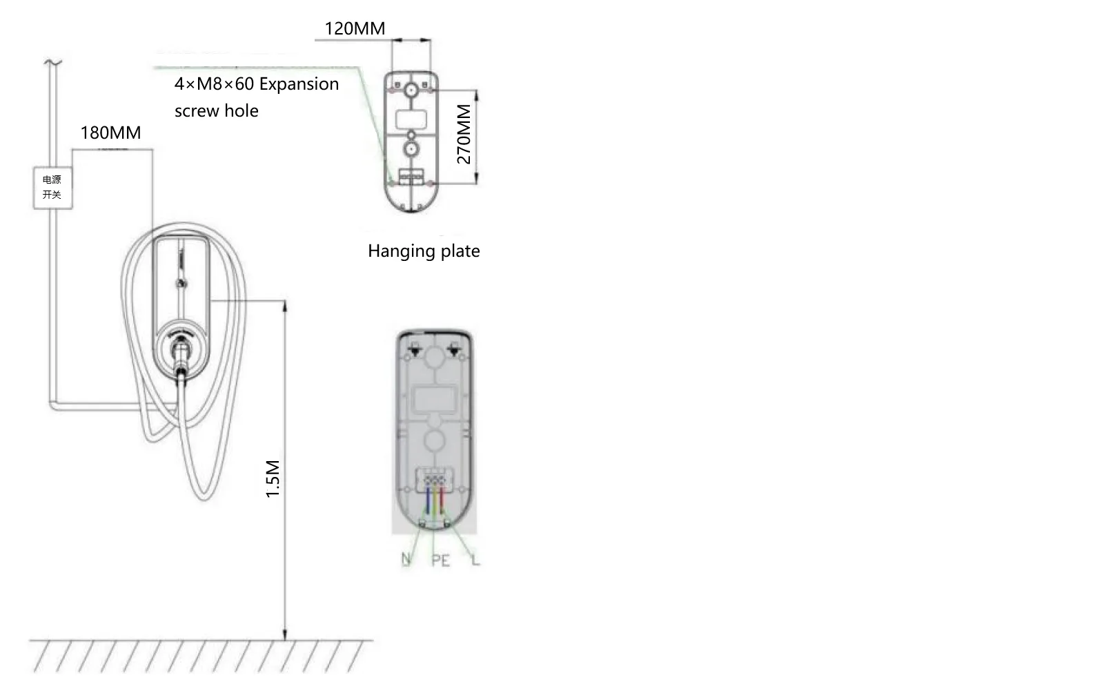 1) Referenční údaje o výšce nabíjecí hromady od země (1,3-1,5 metru)2) Označte polohu montážního otvoru na zadní desce na stěně podle polohy montážního otvoru na zadní desce.